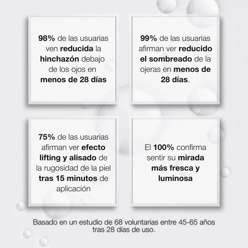 Su fórmula natural actúa al instante para reducir bolsas y signos de fatiga, devolviéndote esa mirada viva que refleja energía y confianza.